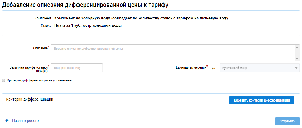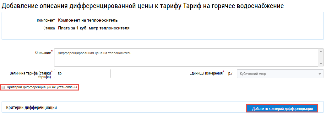 Выберите единицы измерения величины тарифа из выпадающего списка. В случае, если критерии дифференциации не установлены, установите флажок в соответствующее поле. Для выбора критериев дифференциации нажмите на кнопку Добавить критерий дифференциации.