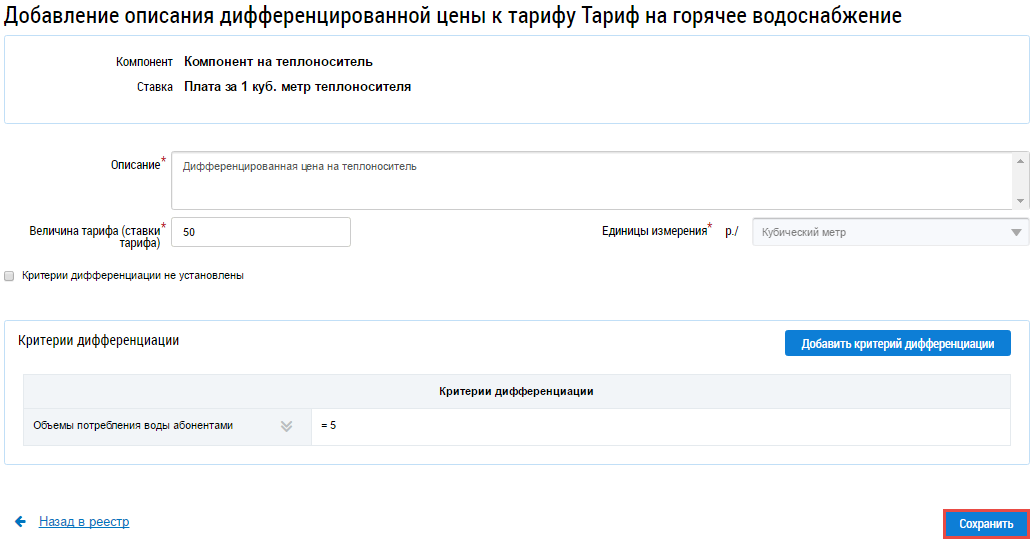 После заполнения полей на странице Добавление описания дифференцированной цены к тарифу нажмите на кнопку Сохранить.