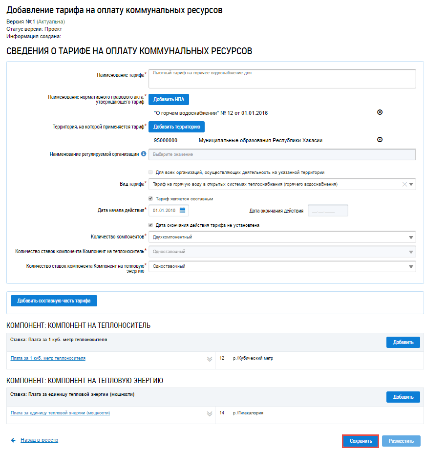 Система отображает страницу Добавление тарифа на оплату коммунальных ресурсов с внесенными ранее сведениями. После заполнения формы добавления тарифа нажмите на кнопку Сохранить.