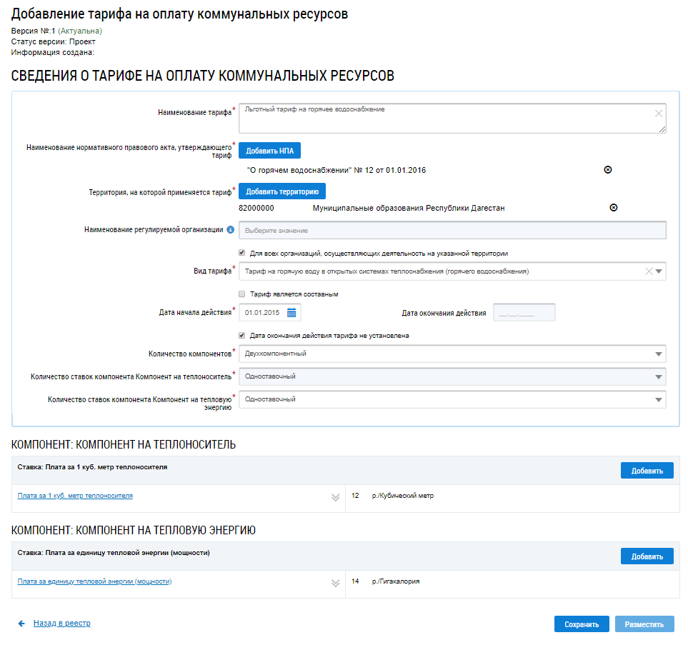 Отображается страница добавления тарифа на оплату коммунальных ресурсов с предзаполненными на основании выбранного тарифа сведениями.