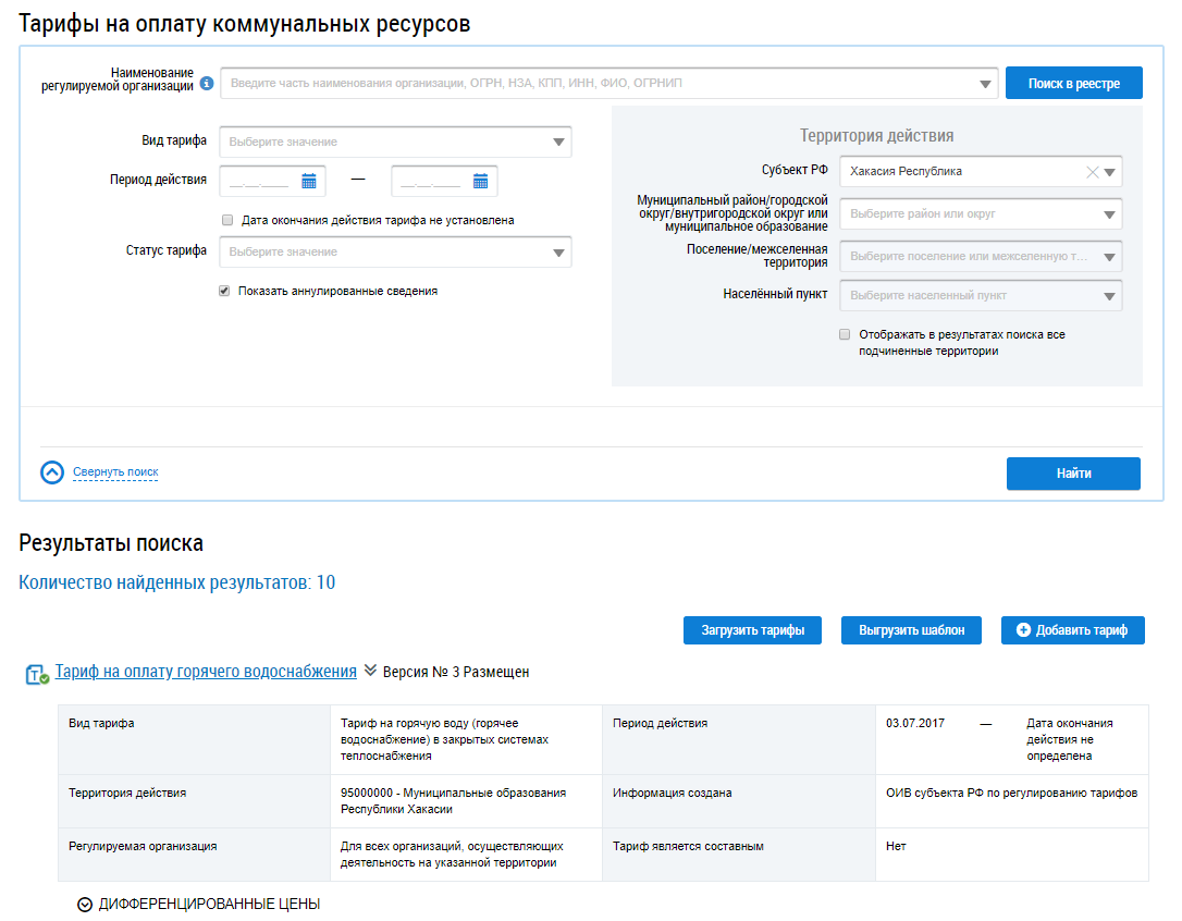 Отображается страница Тарифы на оплату коммунальных ресурсов.