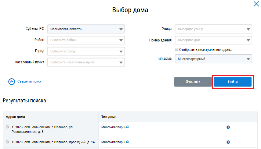 В отобразившемся окне Выбор дома последовательно заполните поля, начиная с поля Субъект РФ и выбирая значения из выпадающих списков. При необходимости установите флажок Отобразить неактуальные адреса. После заполнения параметров поиска нажмите на кнопку Найти.