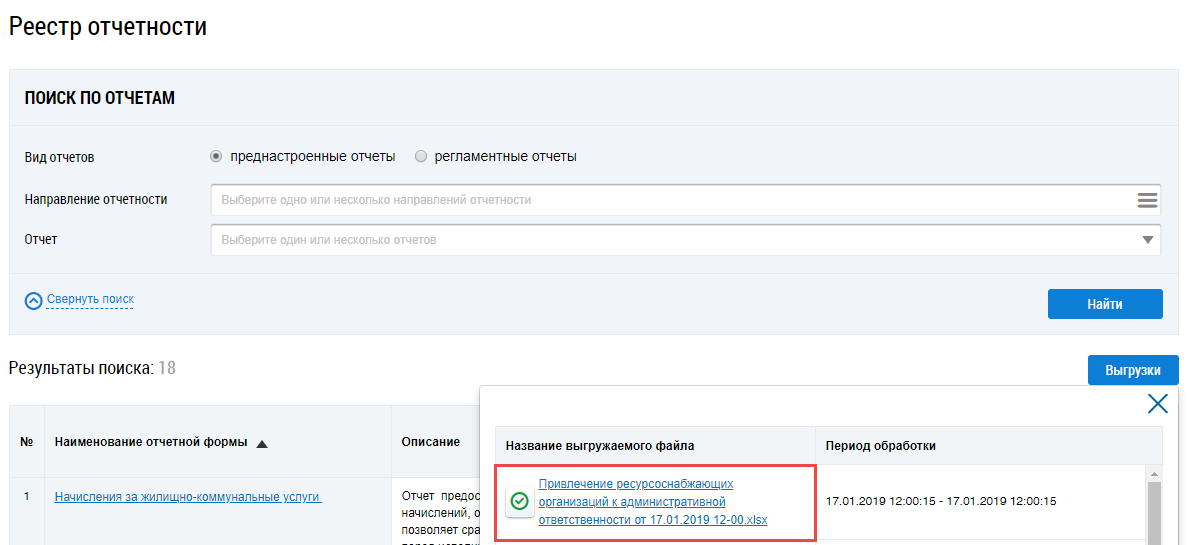 Для сохранения сформированного отчета нажмите на кнопку Выгрузки на странице Реестр отчетности и выберите в выпадающем списке необходимый отчет.