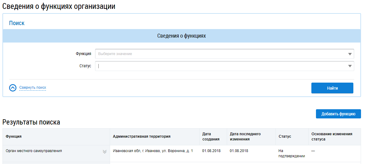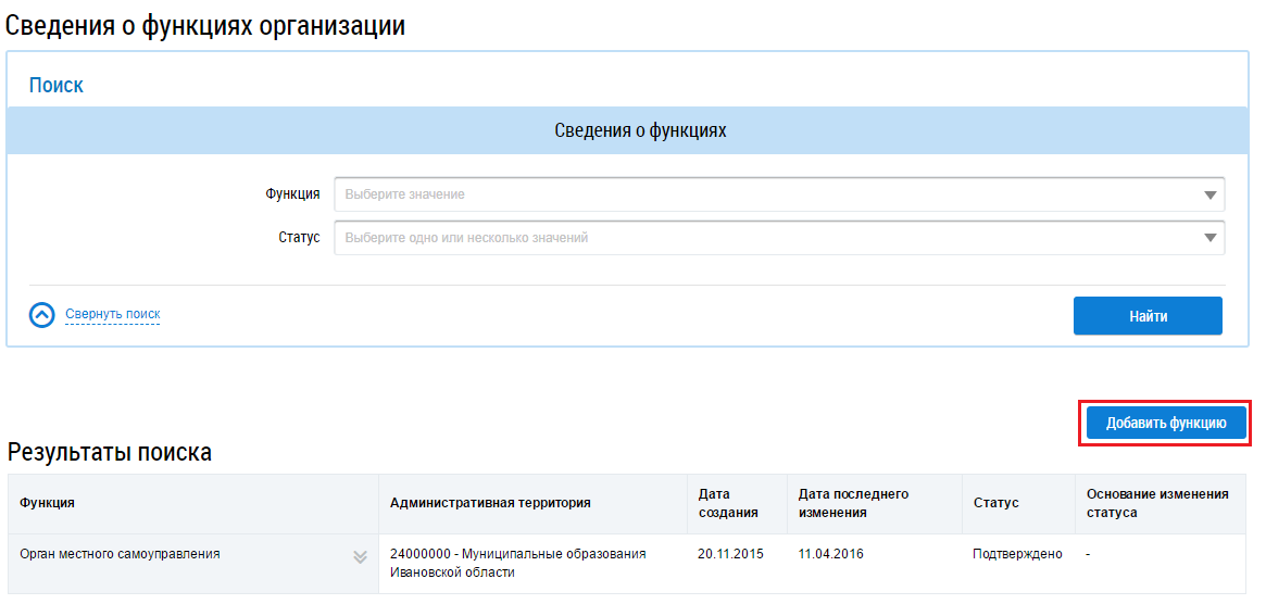 Для добавления функции организации нажмите на кнопку Добавить функцию на странице Сведения о функциях организации.