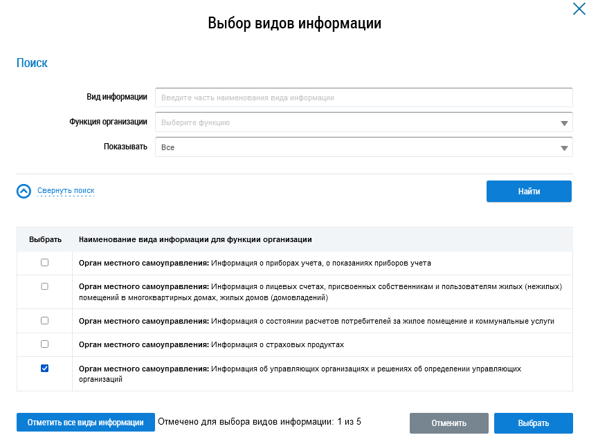 Установите флажки напротив необходимых видов информации или нажмите на кнопку Отметить все виды информации и нажмите на кнопку Выбрать (Окно «Выбор видов информации»).