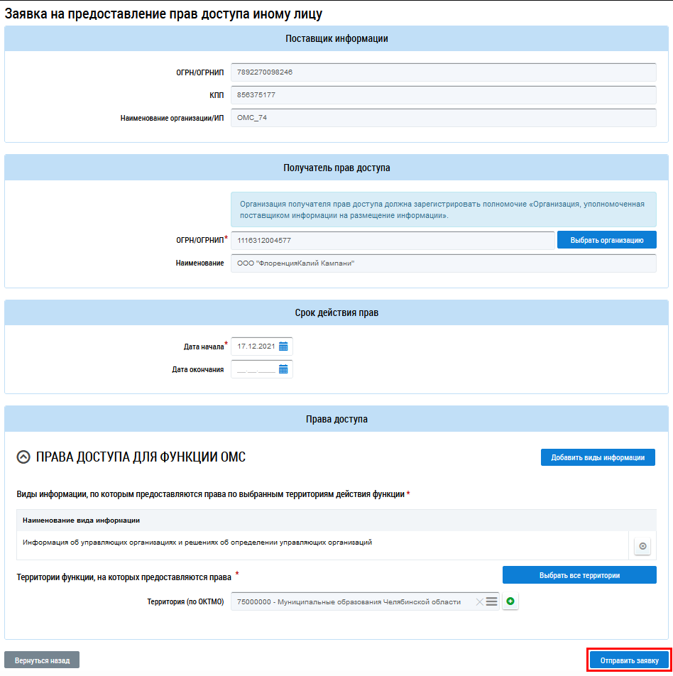 Для отправки заявки получателю прав нажмите на кнопку Отправить заявку (доступно для руководителей организации).