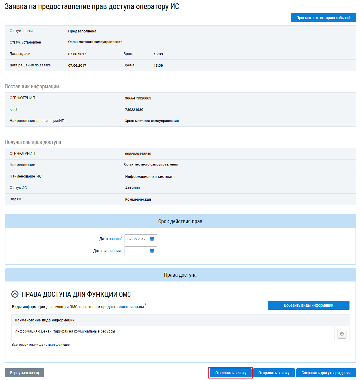Рис. 1. Заявка на предоставление прав доступа Оператору ИС. Кнопка «Отклонить заявку»