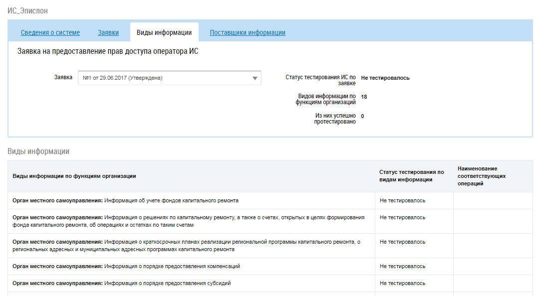 Вкладка Виды информации содержит сведения о тестировании ИС и результатах тестирования, если была подана заявка на тестирование. Для просмотра результатов тестирования определенной заявки выберите в выпадающем списке поля Заявка необходимое значение.