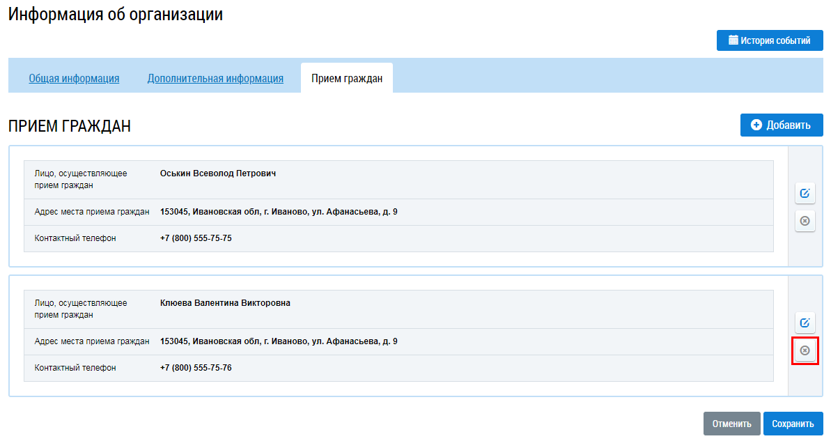 Для удаления информации о приеме граждан нажмите на пиктограмму удаления напротив блока с подлежащей удалению информацией о приеме.