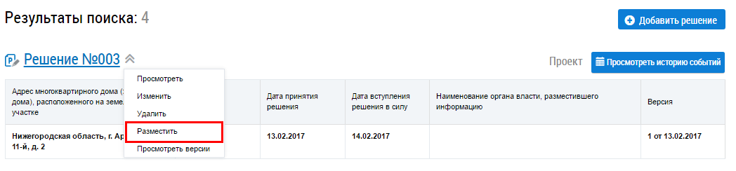 Для размещения информации о решении об изъятии земельных участков выберите пункт контекстного меню Разместить.