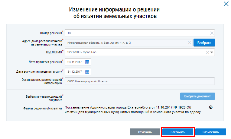 Отображается страница Изменение информации о решении об изъятии земельных участков.