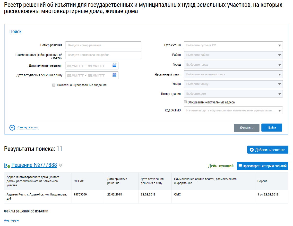 Отображается страница Реестр решений об изъятии для государственных и муниципальных нужд земельных участков, на которых расположены многоквартирные дома, жилые дома.