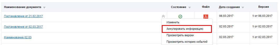 Для аннулирования документа выберите пункт Аннулировать информацию для документа в статусе Документ размещен.