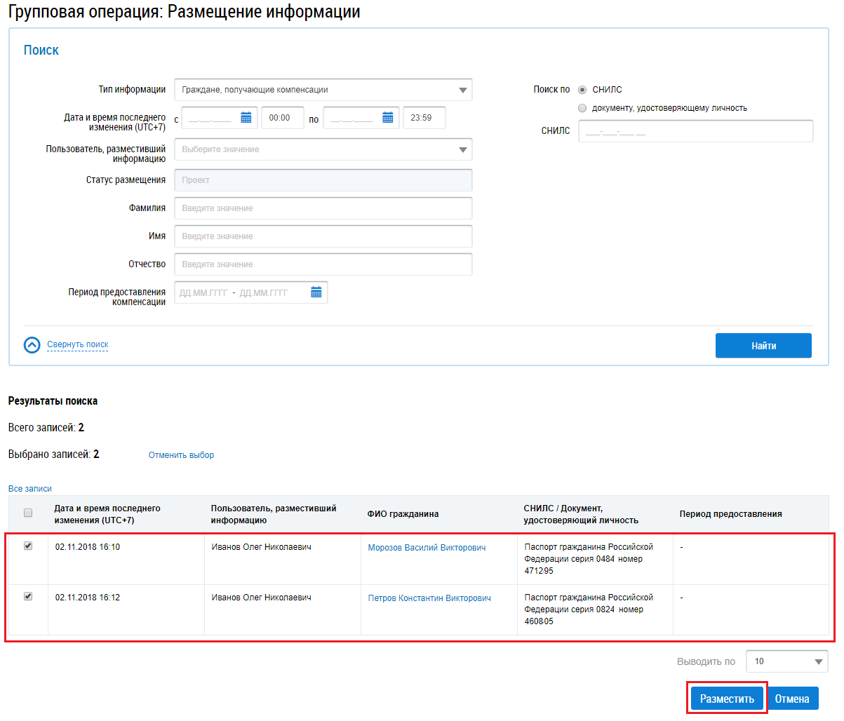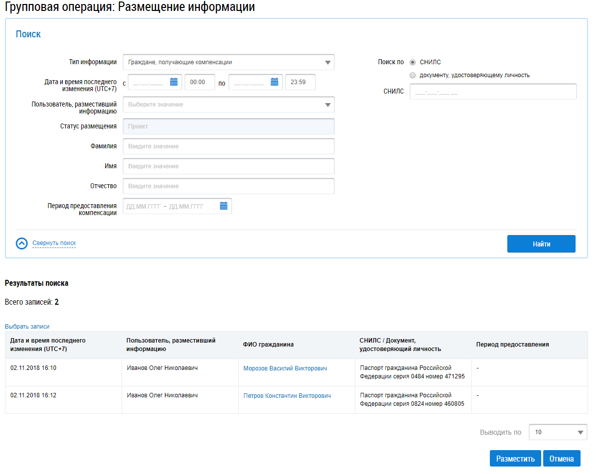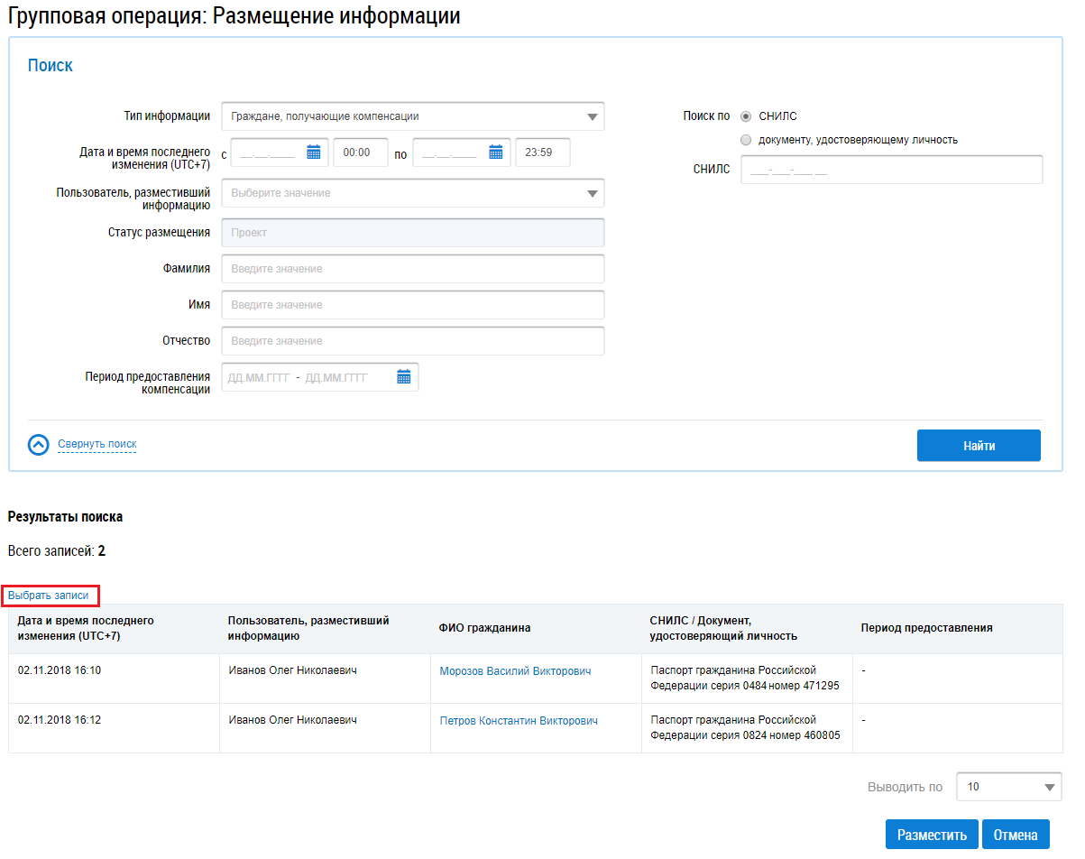 Выберите одну или несколько записей с информацией о гражданах, получающих компенсации расходов, и нажмите на кнопку Разместить. Для возврата ко всем записям нажмите на кнопку Все записи.