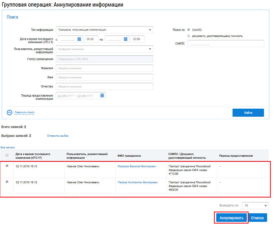 Выберите одну или несколько записей информации о гражданах, получающих компенсации, и нажмите на кнопку Аннулировать.