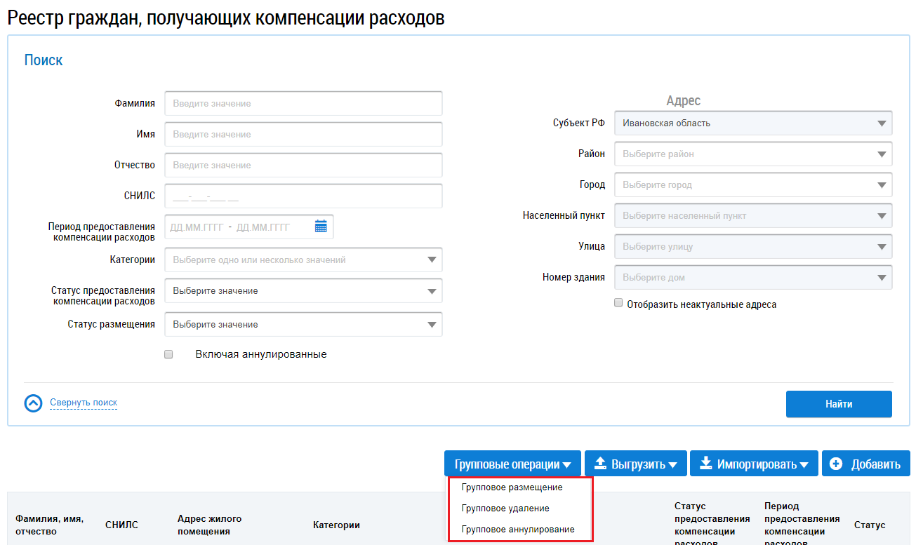 Для удаления информации о гражданах, получающих компенсации расходов на оплату жилого помещения и коммунальных услуг, раскройте контекстное меню кнопки Групповые операции и выберите пункт Групповое удаление.