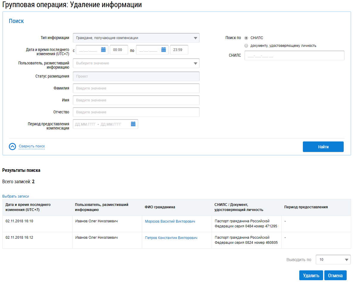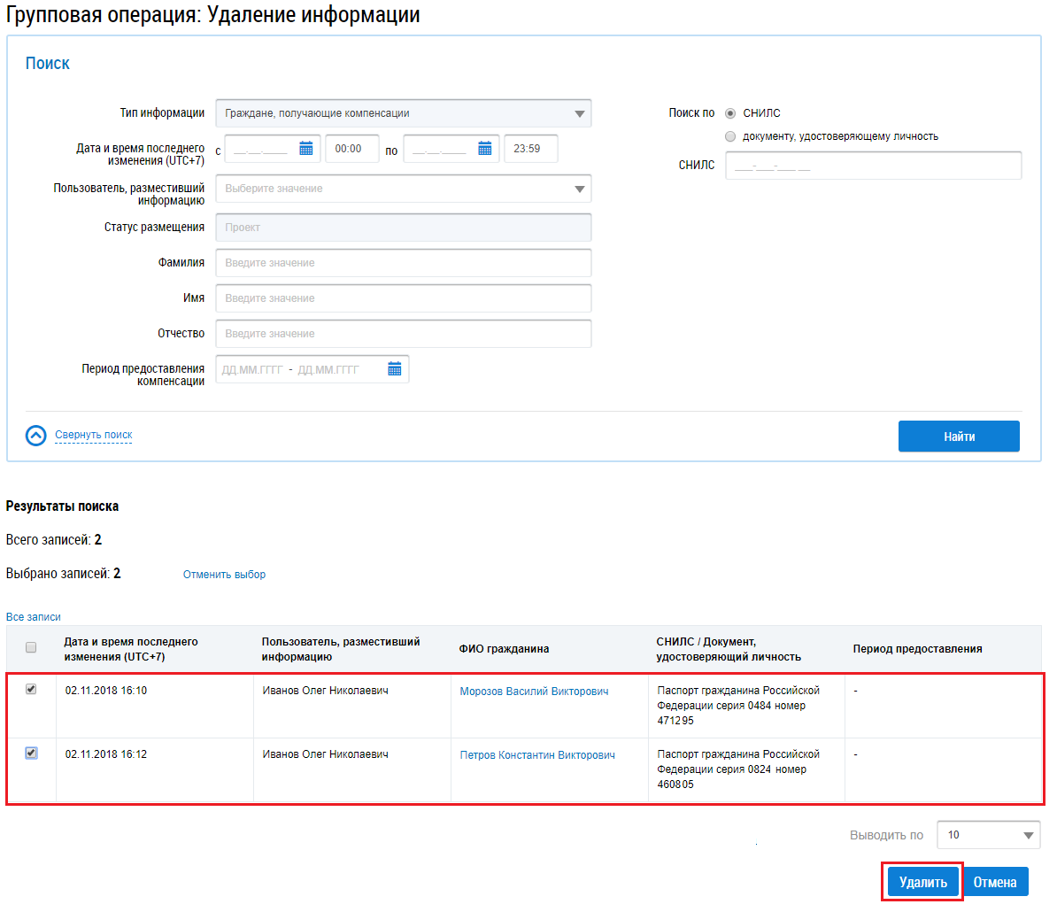Выберите одну или несколько записей информации о гражданах, получающих компенсации, и нажмите на кнопку Удалить.