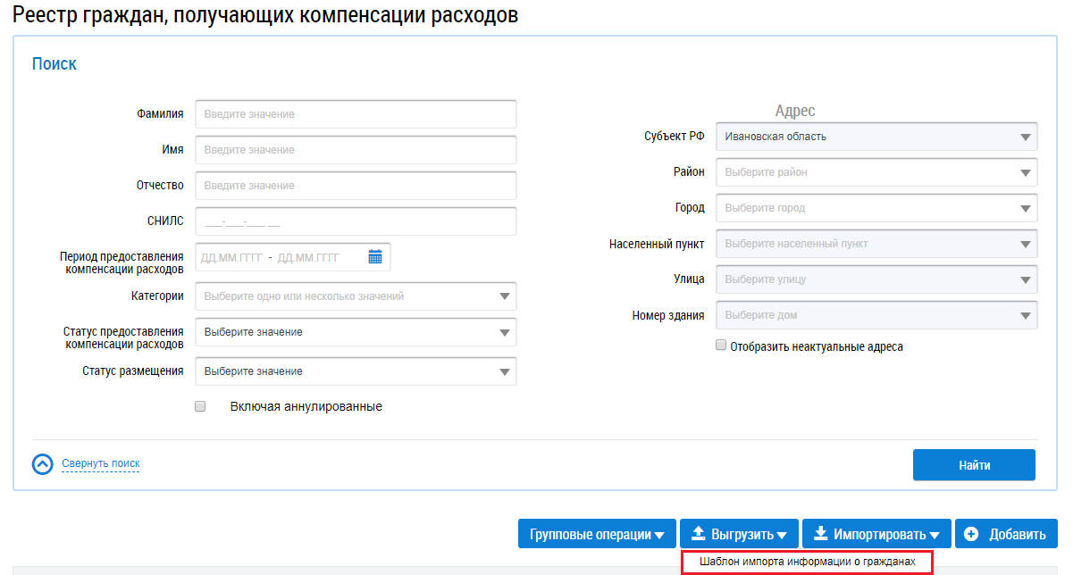 Для получения шаблона импорта сведений о гражданах для последующей загрузки информации в Систему нажмите на кнопку Выгрузить и выберите пункт Шаблон импорта информации о гражданах.