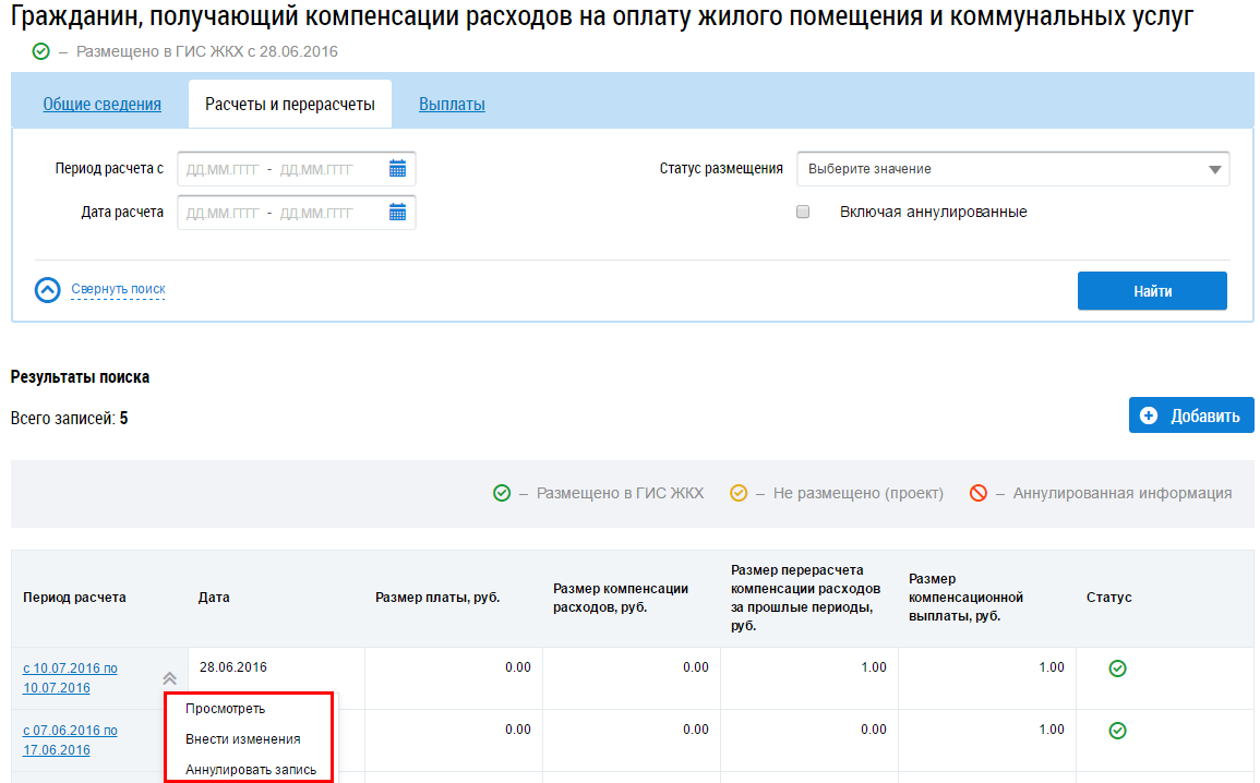 Чтобы внести изменения в расчет предоставляемой компенсации расходов в статусе Размещено в ГИС ЖКХ, раскройте контекстное меню и выберите пункт Внести изменения.