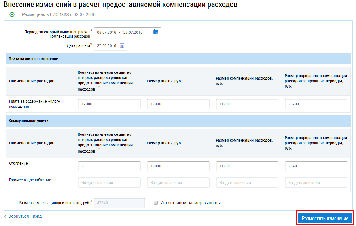 На отобразившейся странице Внесение изменений в расчет предоставляемой компенсации расходов внесите изменения и нажмите на кнопку Разместить изменение.