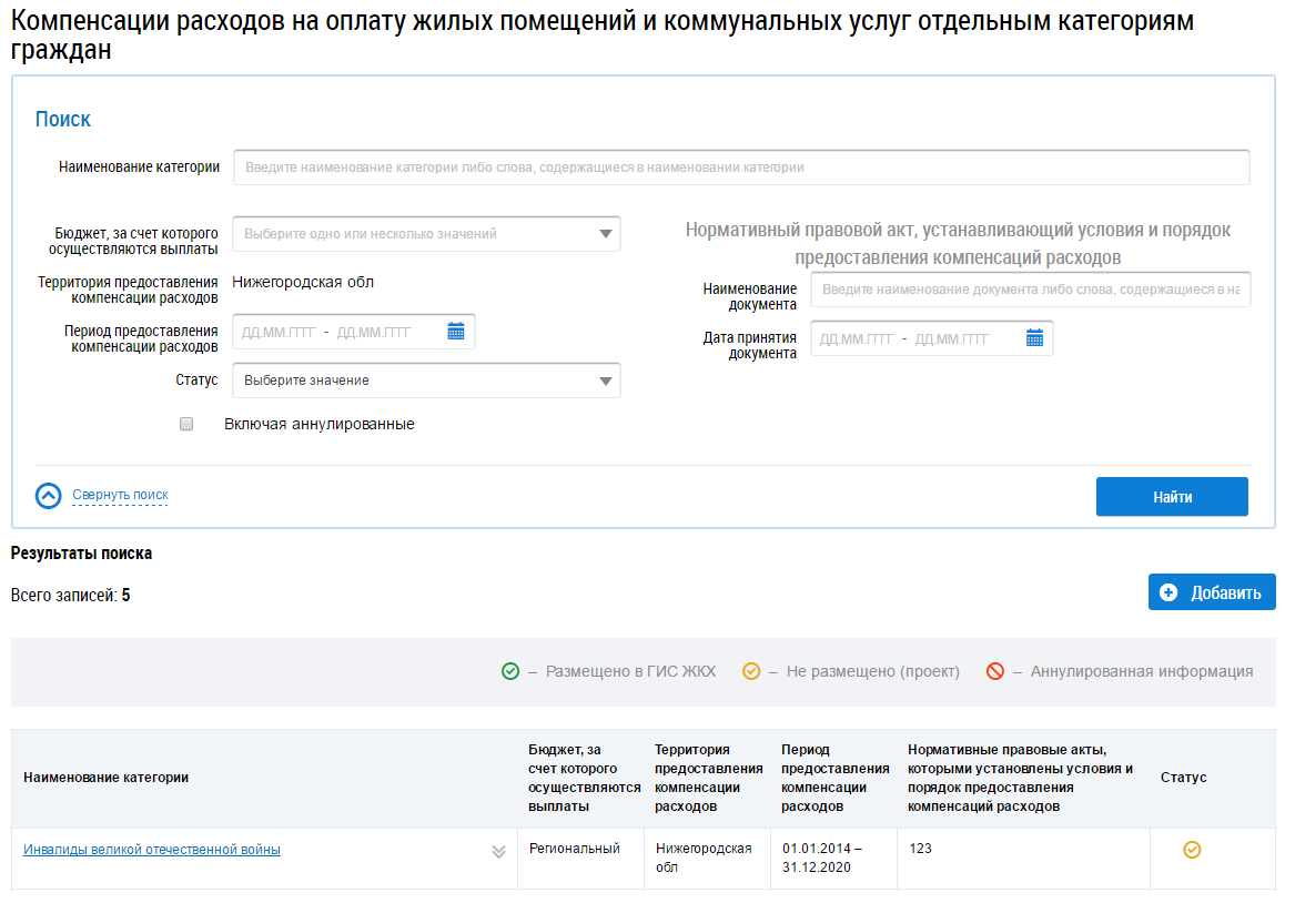 Страница Компенсации расходов на оплату жилых помещений и коммунальных услуг отдельным категориям граждан содержит блок поиска, блок результатов поиска, кнопки: Очистить, Найти, Добавить.