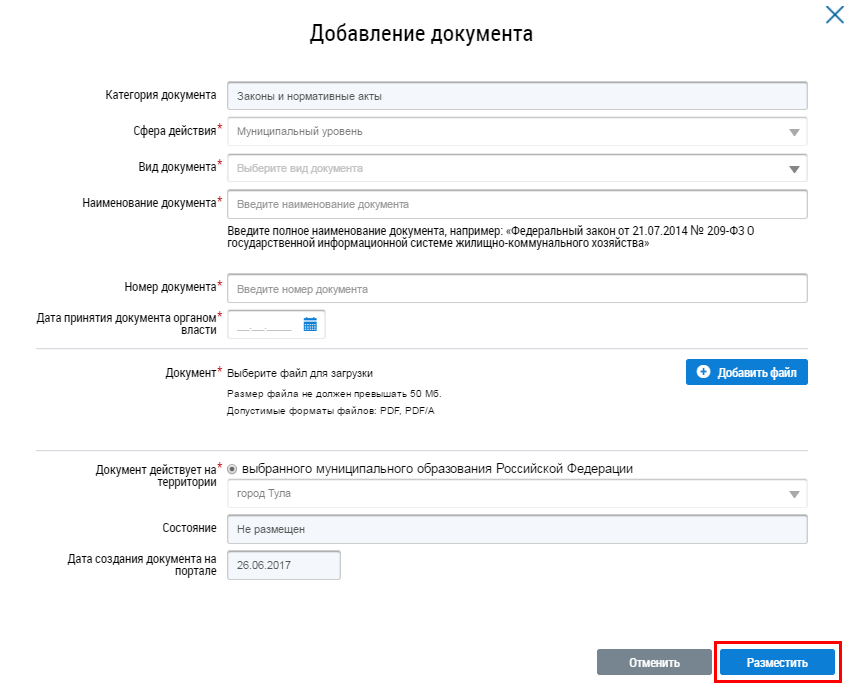 В отобразившемся окне Добавление документа заполните обязательные поля и нажмите на кнопку Разместить.