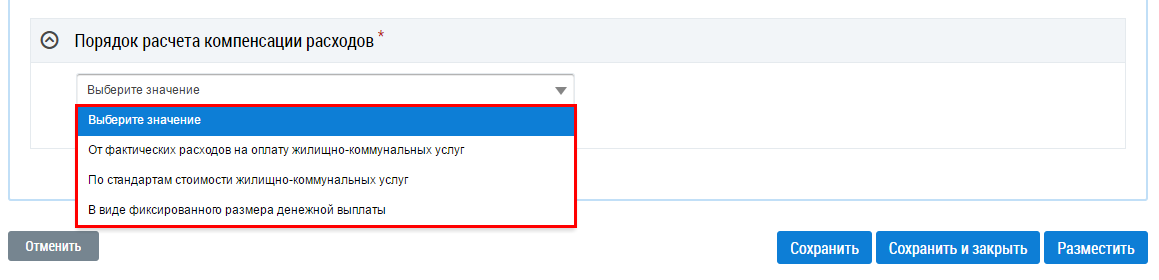 Заполните блок Порядок расчета компенсации расходов, выбрав значение из выпадающего списка.