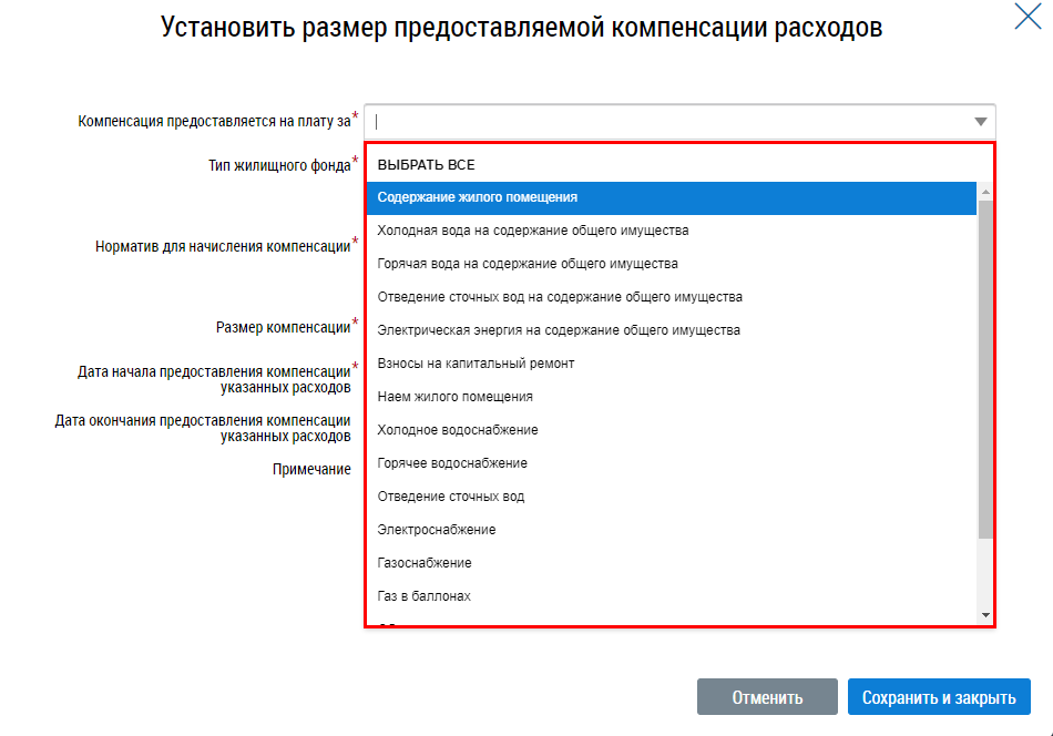 Заполните обязательные поля. Для заполнения полей Компенсация предоставляется на оплату за, Тип жилищного фонда выберите одно или несколько значений из выпадающих списков.