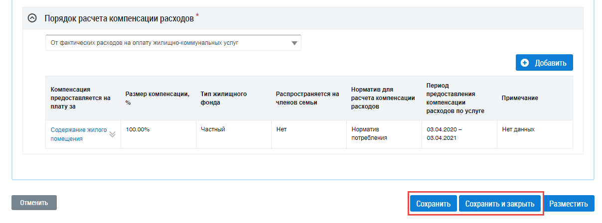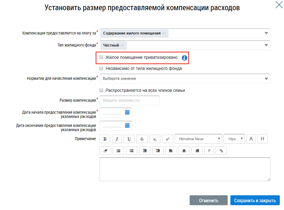 После заполнения обязательных полей нажмите на кнопку Сохранить и закрыть (Окно «Установить размер предоставляемой компенсации расходов». Поле «Жилое помещение приватизировано»).