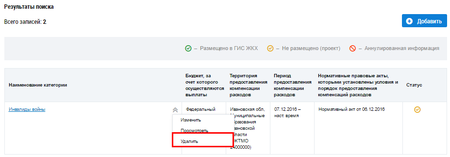 Для удаления сведений об отдельной категории граждан выберите пункт контекстного меню Удалить.