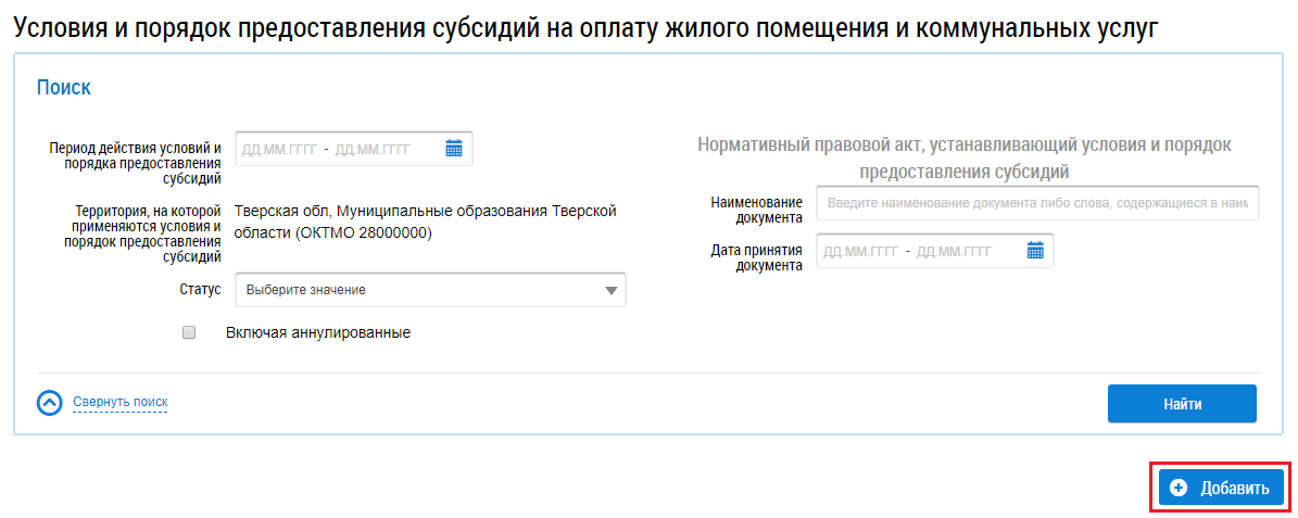 Чтобы добавить информацию об условиях и порядке предоставления субсидий, нажмите на кнопку Добавить. Отображается страница Добавление информации об условиях и порядке предоставления субсидий.