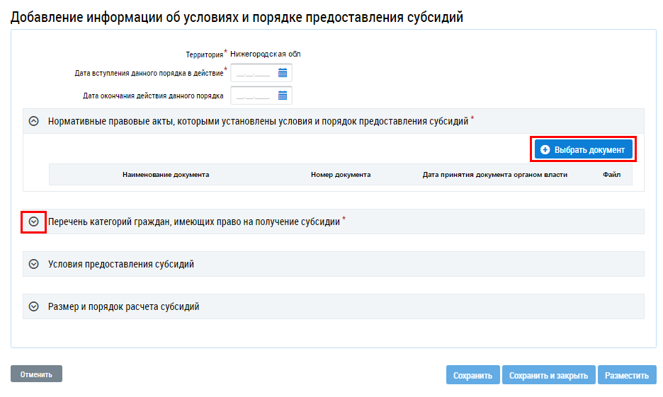Заполните обязательные поля, выберите нормативные правовые акты, устанавливающие категорию граждан, нажав на кнопку Выбрать документ.