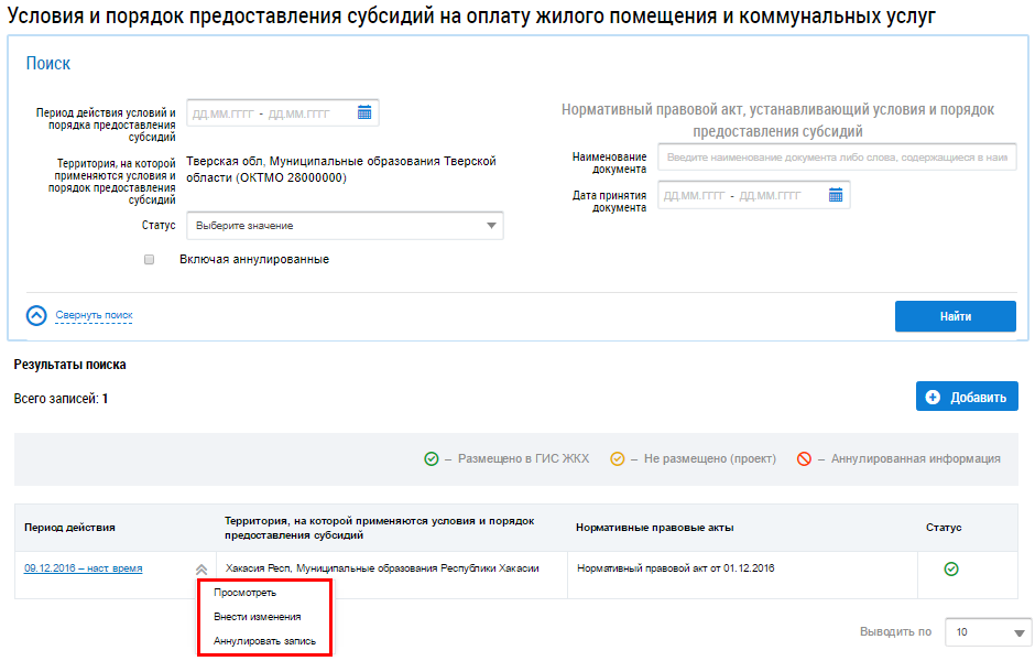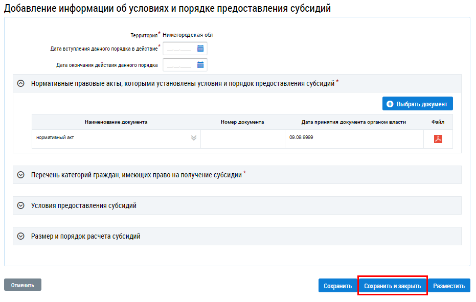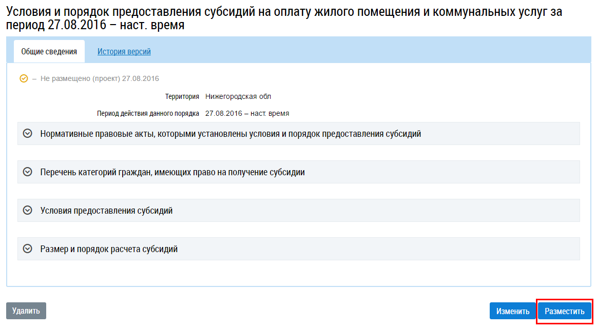 Для размещения информации нажмите на кнопку Разместить на странице просмотра информации об условиях и порядке предоставления субсидий на оплату жилого помещения и коммунальных услуг.