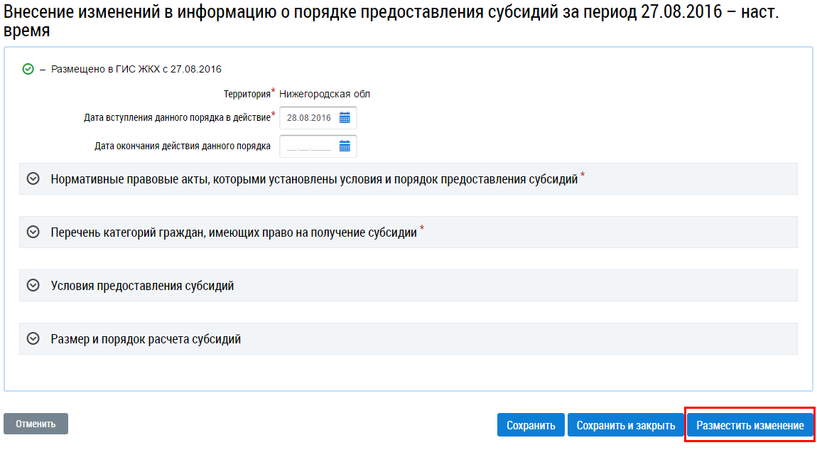 На отобразившейся странице Внесение изменений в информацию о порядке предоставления субсидий внесите изменения и нажмите на кнопку Разместить изменение.