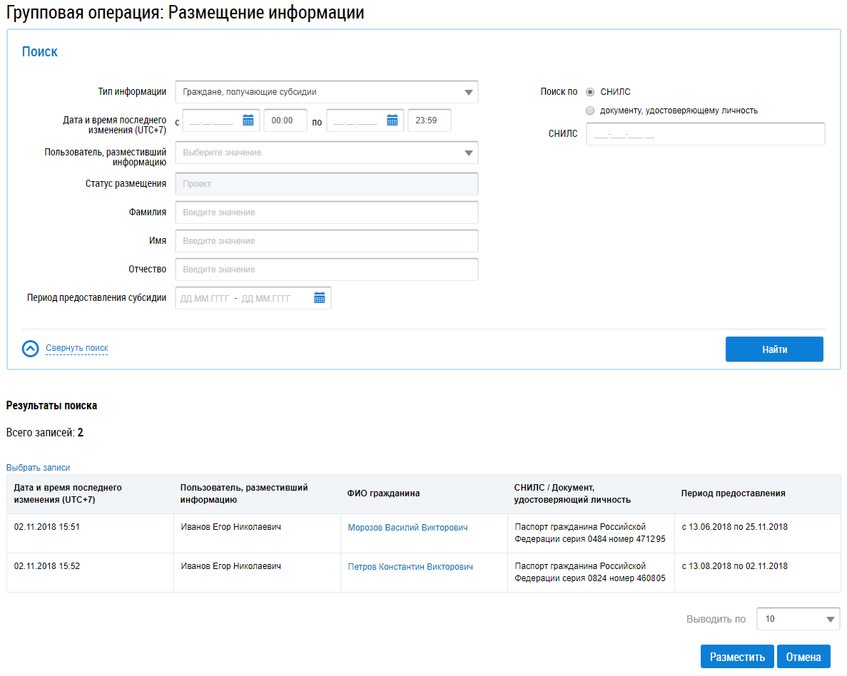 Выберите одну или несколько записей с информацией о гражданах, получающих субсидии, и нажмите на кнопку Разместить. Для возврата ко всем записям нажмите на кнопку Все записи.