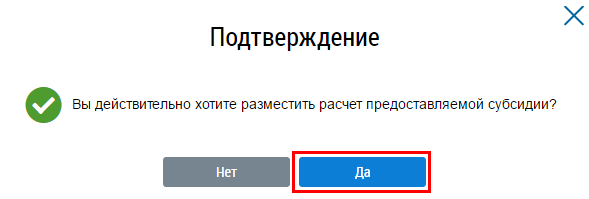 Подтвердите действия по размещению расчета предоставляемой субсидии, нажав на кнопку Да.