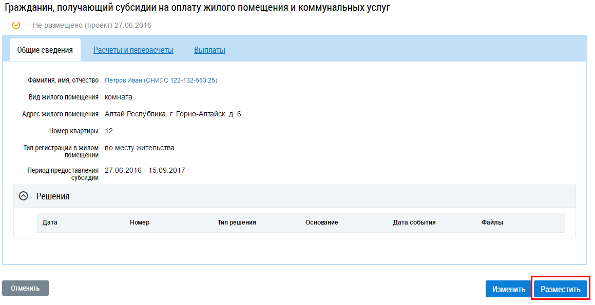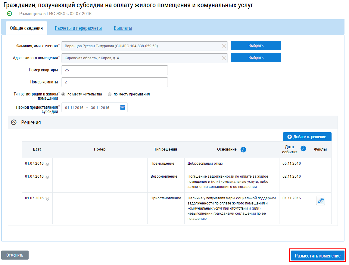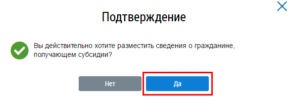 Подтвердите действия по размещению сведений о гражданине, получающем субсидии.