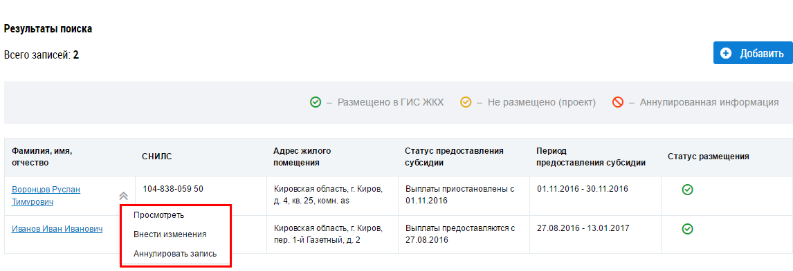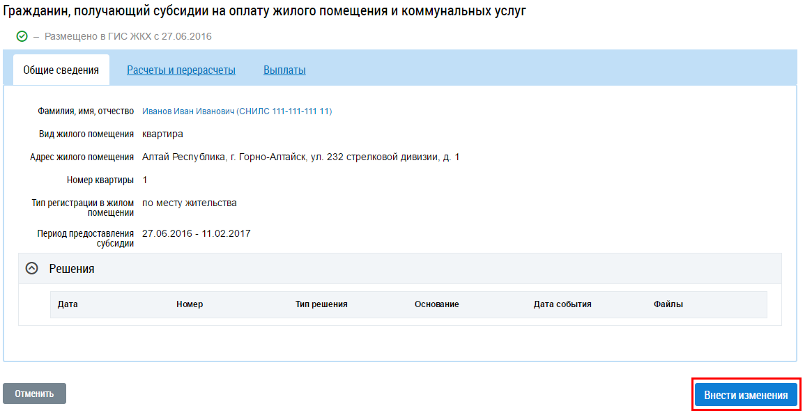 Чтобы внести изменения о гражданах, получающих субсидии, раскройте контекстное и выберите пункт Внести изменения и на странице Реестр граждан, получающих субсидии.