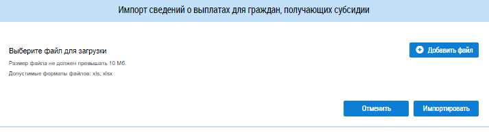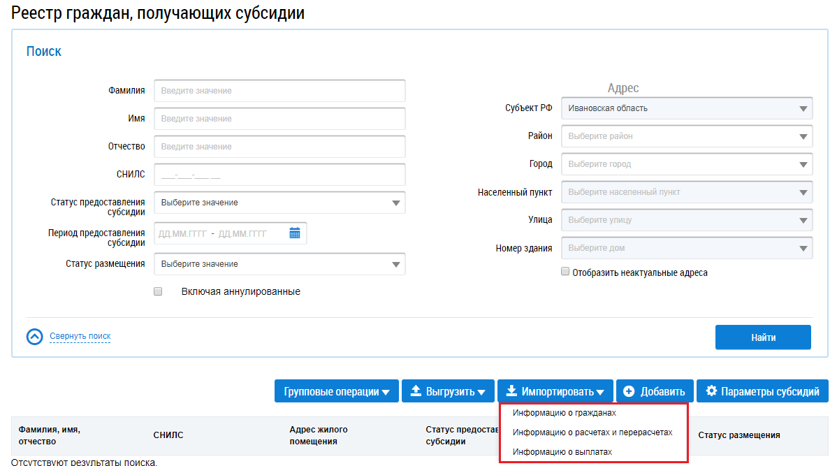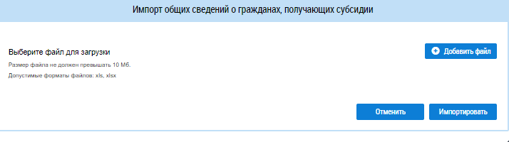 Для импорта информации необходимо нажать на кнопку Импортировать на странице Граждане, получающие субсидии и выбрать один из пунктов Информация о гражданах, Информация о расчетах и перерасчетах, Информация о выплатах выпадающего меню кнопки Импортировать.