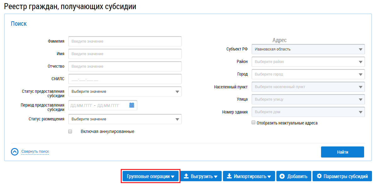 Для осуществления групповых операций с информацией о гражданах, получающих субсидии, нажмите на кнопку Групповые операции.