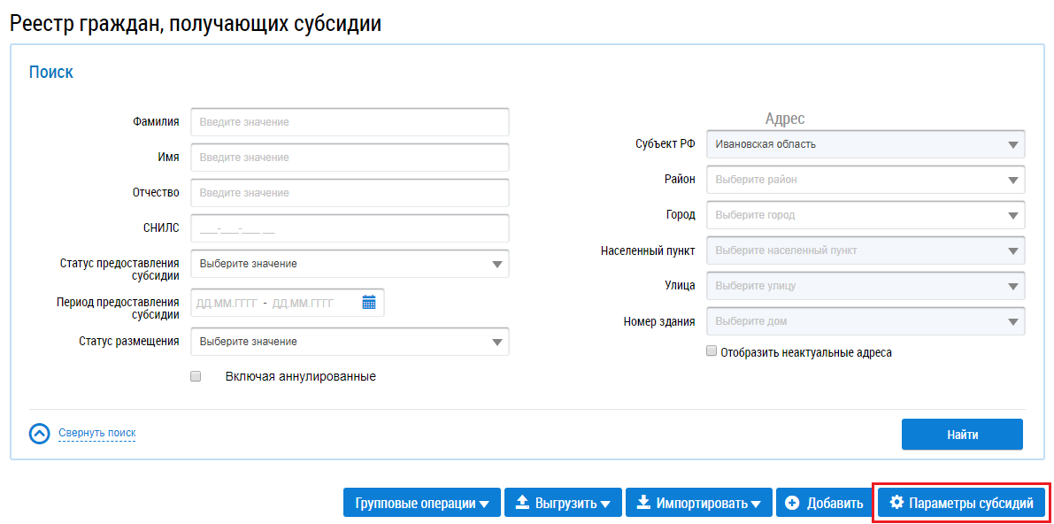 Отображается окно c параметрами предоставления субсидий.
