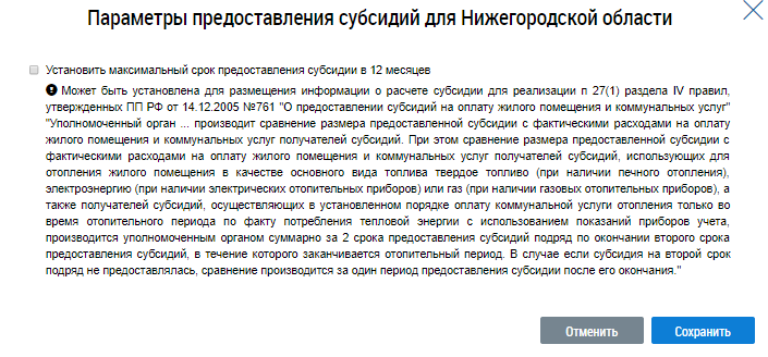 При необходимости установите флажок в поле Установить максимальный срок предоставления субсидии в 12 месяцев и нажмите на кнопку Сохранить.