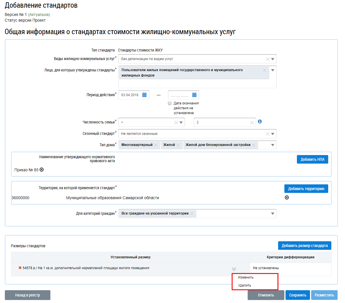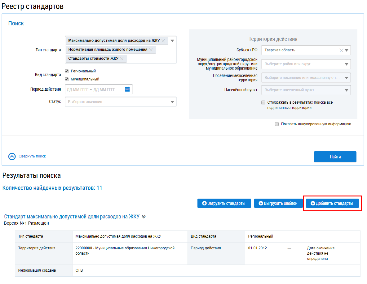 Далее описаны действия в случае выбора вида стандарта Стандарты стоимости ЖКУ.