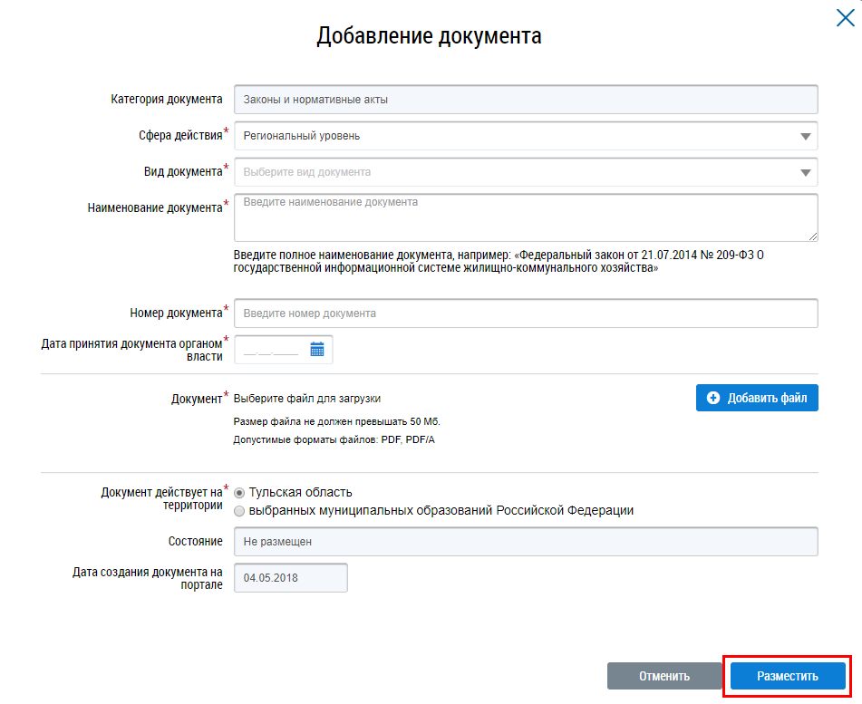 Заполните обязательные поля и нажмите на кнопку Разместить.