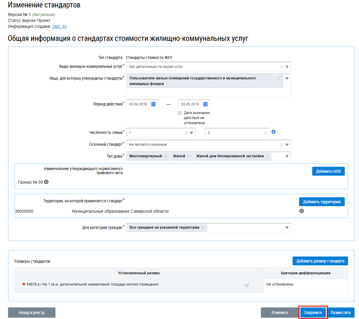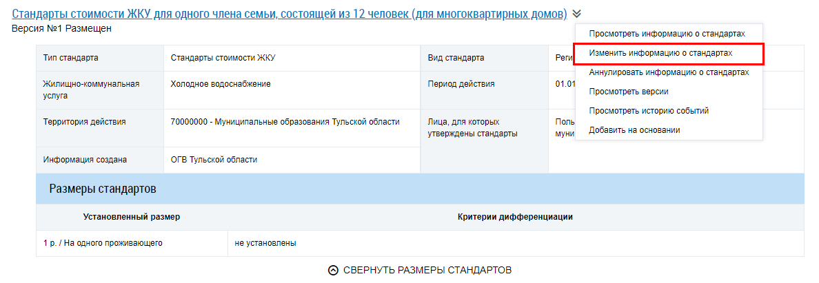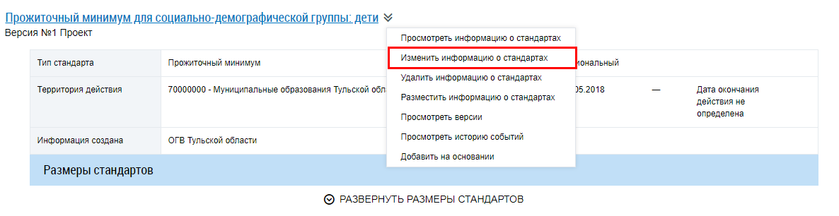 Чтобы изменить информацию о стандартах, раскройте контекстное меню и выберите пункт Изменить информацию о стандартах.