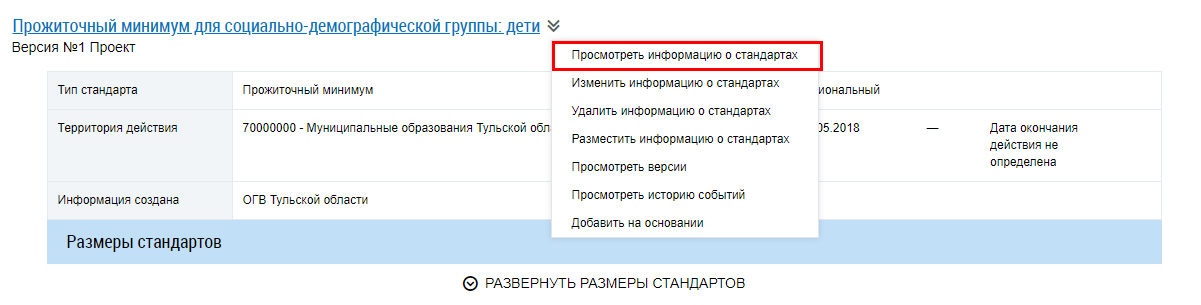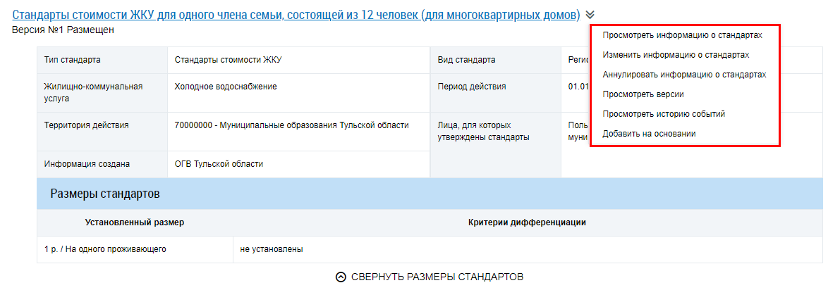 Для просмотра информации о стандартах стоимости ЖКУ нажмите на гиперссылку с наименованием стандарта или раскройте контекстное меню и выберите пункт Просмотреть информацию о стандартах.
