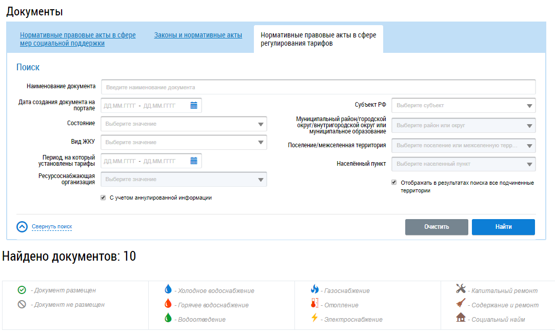 Для перехода к перечню нормативных правовых актов в сфере регулирования тарифов на ЖКУ в разделе горизонтального навигационного меню Дополнительная информация, выберите пункт Тарифы ЖКУ, в выпадающем списке выберите подпункт Нормативные правовые акты в сфере регулирования тарифов на ЖКУ (Раздел меню «Дополнительная информация»). Отображается страница Документы на вкладке Нормативные правовые акты в сфере регулирования тарифов.