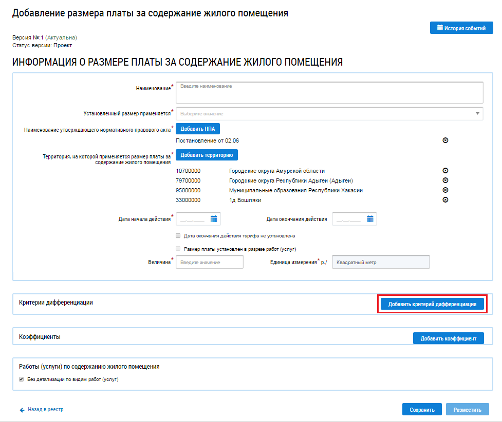 Выбранный критерий отобразится на странице Добавление размера платы за содержание жилого помещения.