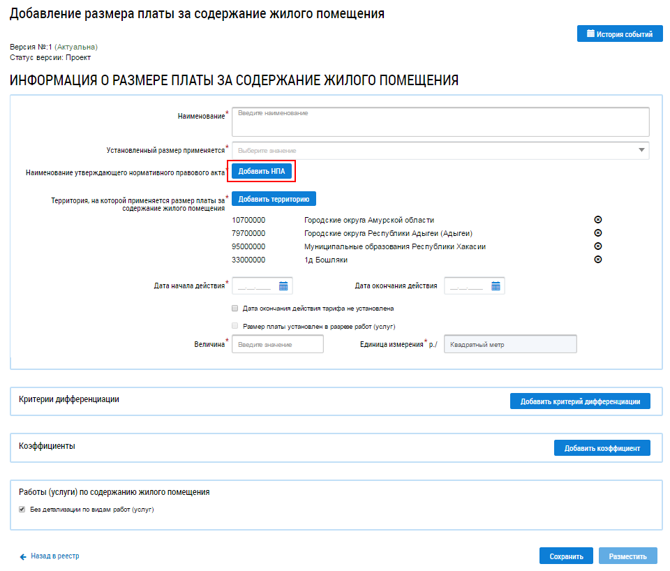 Заполните обязательные поля и нажмите на кнопку Разместить. Чтобы добавить территорию, на которой применяется размер платы за содержание жилого помещения нажмите на кнопку Добавить территория. Отображается окно Выбор муниципального образования или населенного пункта, входящего в состав муниципального образования.