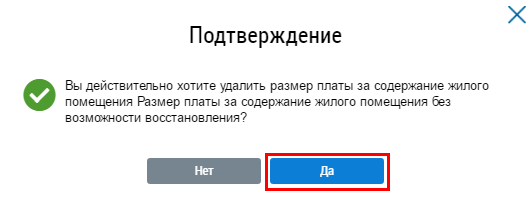 Отображается окно подтверждения удаления размера платы за содержание жилого помещения.